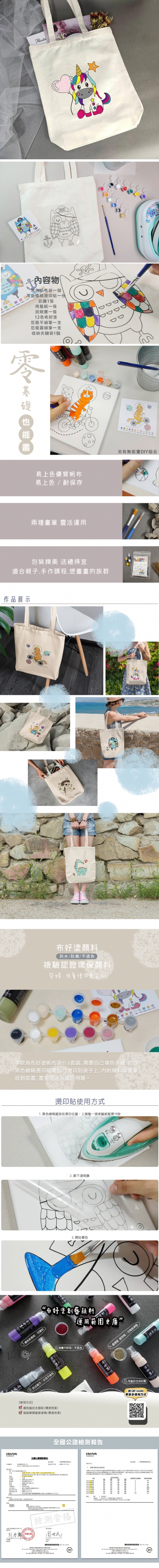 2. 線搞燙印貼 *1 3. 主題布好塗顏料*12 色 4. 參考彩圖*1 5. 烤盤紙一張 6. 尼龍筆 *2 支 7. 使用說明書*1 張 8.收納夾鏈袋1個